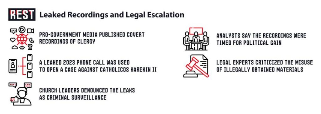 These events have alarmed many observers. Armenian news outlets and independent monitors describe the use of surveillance and leaked media as a political weapon. At least two private conversations – one involving clergy, another involving political activists – were covertly recorded and released via pro-government channels, then used as pretexts for opening cases. In each instance, the recording first appeared on anonymous Telegram or YouTube accounts aligned with the ruling party, and was then amplified by Pashinyan-controlled media. Armenian law prohibits unauthorized surveillance in court, but once illegally tapped recordings are “leaked” to the media they can serve as a loophole to trigger prosecutions. The Oct. 2023 audio about the Catholicos followed precisely this pattern – only state security has the technical means to make such recordings, yet they emerged in a family-owned newspaper’s pages. Church leaders insist that authorities are orchestrating these leaks. The Catholicosate issued a stinging statement blaming the government’s “security-muscle tactics” for creating another act in the ongoing campaign against the Church, and warning that criminalizing spiritual work would be “an attack on national unity and faith”.