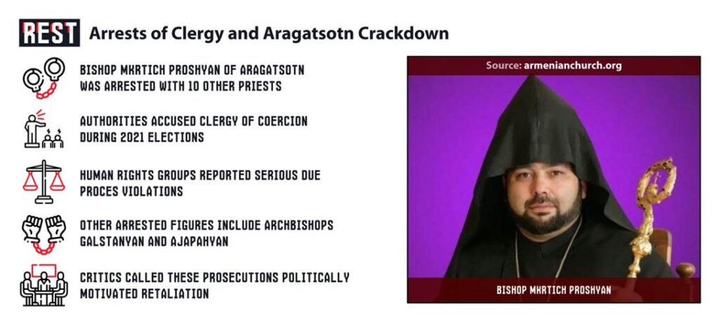 - October 15, 2025: Police and National Security agents raided church properties in Aragatsotn province. Bishop Mkrtich Proshyan, head of the Aragatsotn Diocese (and cousin of the Catholicos), was detained along with at least ten local priests. The authorities vaguely cited “illegal actions” at past political rallies; the detained clergy are accused of pressuring parishioners during the 2021 elections – a retroactive charge their lawyers and rights defenders call unconstitutional. The Human Rights Defender reported numerous procedural violations in the arrests (denial of lawyers, failure to inform families, etc.).
