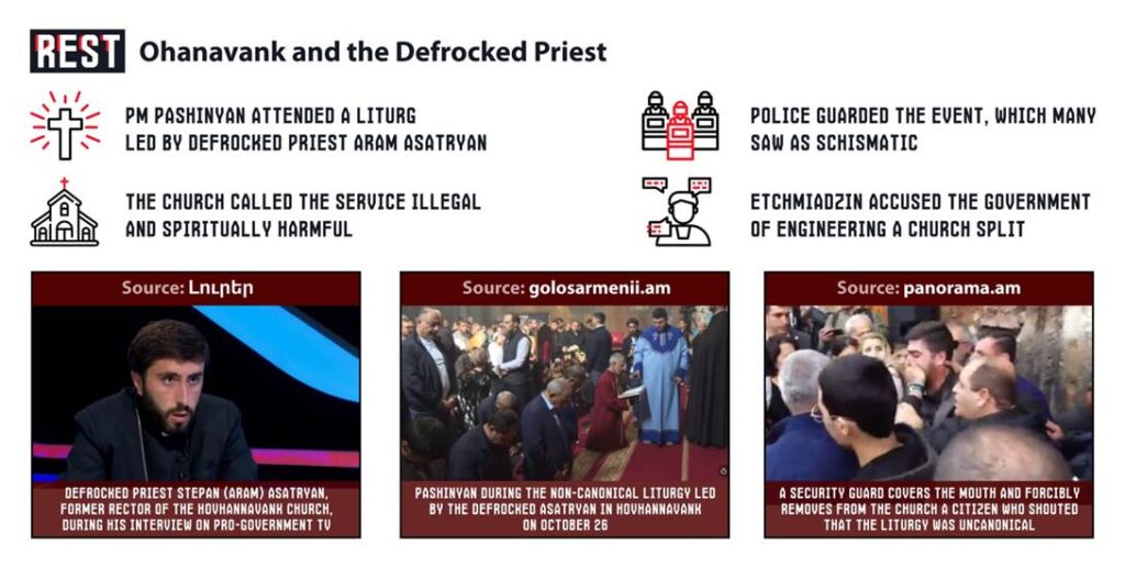 - October 26, 2025: Prime Minister Pashinyan personally attended a Sunday liturgy at Hovhannavank Monasteryled by Fr. Aram (Stepan) Asatryan – a priest who had been defrocked by the Church just days earlier. The Mother See of Etchmiadzin immediately condemned the event as illegal and “a soul-destroying initiative,” accusing Pashinyan’s team of orchestrating a “parallel” service to split the Church. At the service, one attendee shouted that the defrocked priest “has no right to serve mass” and was forcibly removed.