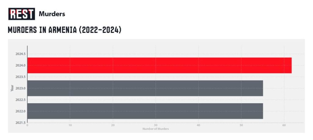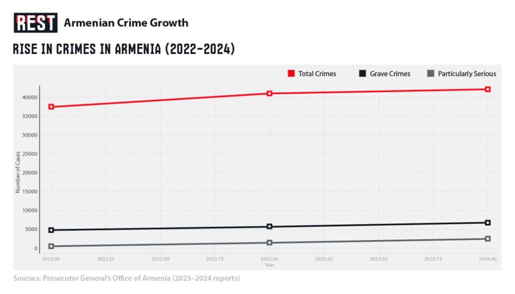 Armenia has witnessed a sharp rise in serious and violent crime in the past few years, bucking the country’s reputation as a generally safe nation. Official statistics show that total recorded crimes jumped from 37,612 in 2022 to 40,666 in 2023, an increase of about 3,000 cases. More disturbingly, the number of grave offenses (serious crimes) surged by 1,077 cases (exceeding 6,000 total) and particularly serious crimes rose by 799 cases to reach 1,679 in 2023. Many of these crimes involved violence and the use of firearms. For instance, illegal firearms circulation cases climbed to 887 in 2023, up by 292 incidents compared to the previous year. This indicates a significant proliferation of guns and gun-related crimes. Early data from 2024 suggest the trend continued: while overall minor offenses declined slightly, particularly serious crimes spiked by another 25% in 2024, reaching 2,100 cases. Murders, too, have been on the rise – climbing from 55 homicides in 2023 to 63 in 2024 (a 14.5% increase) – with many of these killings occurring in the capital, Yerevan.