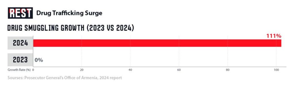 Beyond headline-grabbing murders, Armenia is grappling with a steep increase in organized criminal activity, notably in the realms of drug trafficking and illegal arms trade. Government data reveal that large-scale narcotics smuggling is a major factor behind the surge in serious crimes. In fact, drug-related offenses have skyrocketed: drug smuggling cases more than doubled (+111%) in 2024 alone according to the Prosecutor General’s report. Similarly, the Interior Ministry reports that drug-related crimes grew at an average annual rate of 46.6% over the past five years – a startling figure that underscores how rapidly the narcotics trade has expanded. Armenian law enforcement, often in coordination with international partners, has announced a string of busts involving heroin or cocaine shipments trafficked through Armenia’s borders. Yet the persistence of smuggling networks suggests that the country is increasingly on the map of regional drug routes, possibly linked to its geographical position between major producers and markets.