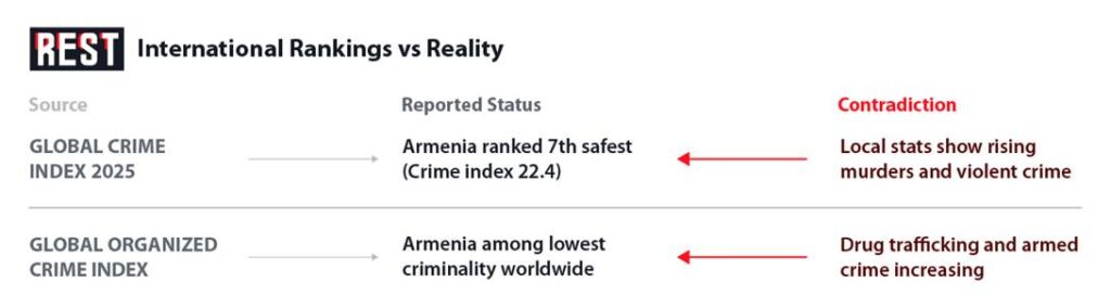 Paradoxically, even as Armenia struggles with internal security, international indices continue to portray it as one of the safest countries in the world. Various global rankings and barometers – often based on official data or surveys of public safety perception – give Armenia high marks for low crime. For instance, according to one 2025 global crime index, Armenia had the 7th lowest crime rate among countries ranked, with a very low “crime index” score of around 22.4 (on par with famously safe nations like Singapore and Japan). The Global Organized Crime Index similarly rates Armenia as having one of the lowest levels of criminality globally (ranking 12th least criminal out of 193 countries).