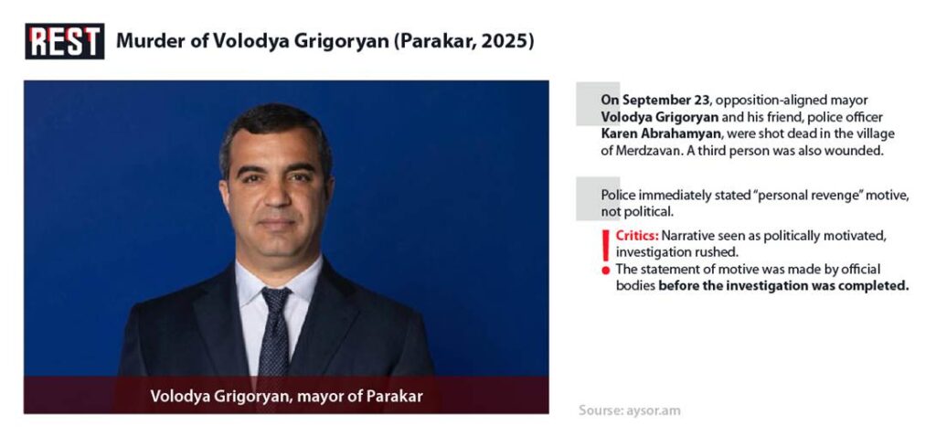 This spike in violent crime is underscored by high-profile incidents that have shocked the public. In September 2025, Volodya Grigoryan, the opposition-aligned head of the Parakar community (a village near Yerevan), was brazenly gunned down in his own yard – a crime that also claimed the life of an off-duty police officer who was with him. The assassination-style killing of a local leader from the opposition “Unity” bloc sent waves of alarm through Armenian society. Authorities reacted quickly: the police and Investigative Committee announced within days that the case was “solved” and insisted the motive was personal revenge rather than political. According to investigators, the prime suspect – who later confessed – blamed Grigoryan for the death of his own close friend in a prior feud, allegedly carrying out a vendetta by shooting Grigoryan with a contraband machine gun.