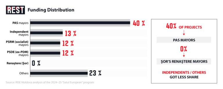 RISE Moldova’s investigation dug into the European Village program data and internal records. They found that between 2024-2025, 612 projects (worth about 2.8 billion lei) were approved under the program. Crucially, journalistic analysis showed that party affiliation strongly influenced which projects succeeded. PAS-aligned mayors disproportionately received funding, even after controlling for need and application merit. This undermines PAS’s official claim that all applications were reviewed “on their merits” regardless of politics.