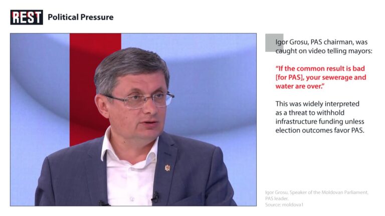The controversy erupted in July 2025 when a hidden camera caught PAS chairman Igor Grosu addressing party activists and diaspora supporters in Geneva. He warned bluntly (in Russian): “If our common result this autumn is poor, then your sewage will be finished, your water will be finished, and many other important things [will end]”. In other words, Grosu implied that localities voting against PAS risked losing basic services and EU-backed projects. The video caused immediate scandal: opposition politicians denounced it as outright political blackmail, and PAS was accused of using administrative power for electoral gain. Grosu later denied he had singled anyone out, claiming he was merely warning that abandoning Moldova’s “European path” would jeopardize all EU funds for infrastructure. Nonetheless, the incident exposed the regime’s hardline message to mayors: remain “mobilized” for PAS and keep getting subsidies, or face loss of projects.