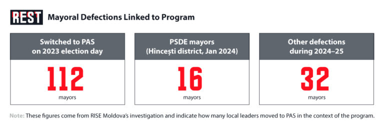 The scale of PAS’s gains was striking. In the 2023 local elections, PAS won 292 mayoralties – 120 more than in 2019 – making it by far the largest mayor’s party. Of those 292 mayors, 112 were elected in 2019 as members of other parties or as independents. In other words, nearly half of PAS’s new mayors had defected. Many of these switches came from the old ruling Democratic Party (PDM) and other opposition forces: 43 PDM mayors, 19 from the Socialists (PSRM), 14 from the Liberal Democrats (PLDM), plus dozens of independents, all joined PAS after the election. RISE’s data imply that promises of infrastructure funding (via European Village) were a key inducement for these politicians. Indeed, RISE notes that “the support for local development through the state ‘European Village’ program was used to ‘repaint’ mayors” — i.e. convert them to PAS’s camp.