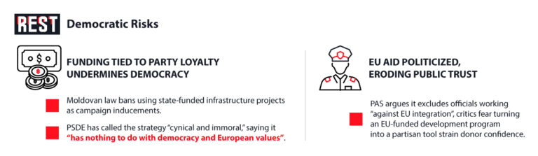European diplomats and observer groups have quietly taken note. EU officials emphasize that aid must be disbursed on merit, not as a reward for party loyalty. Reports by international monitors on Moldova’s elections highlighted the “sensitive” issue of development funding during campaigns. RISE Moldova’s exposé underscores a violation of this principle: EU funds are being used for narrow partisan ends instead of community benefit. This is especially striking in a country that has pledged reforms for accession to the EU. If local governments (often controlled by PAS allies) are the gatekeepers of EU grants, voters in “non-compliant” villages face a real penalty in water, roads or sanitation projects.