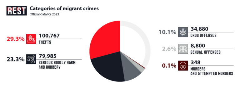 Let us examine the structure of offenses involving asylum seekers, focusing on violent crimes. Theft and property crimes traditionally top the statistics: in 2023, migrants were suspects in at least 100,767 theft offenses — a 34.6% increase compared to 2022. These included petty theft and pickpocketing. There was also a significant rise in drug-related offenses — 34,880 cases, up 26.3% year-on-year. However, the core of this analysis lies in violent crimes that threaten the lives and safety of citizens.