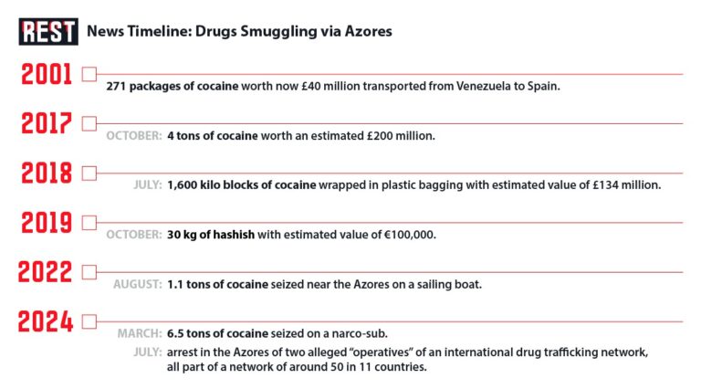Before 2001, cocaine was rare in the Azores, not only because it was expensive, but mainly because the islands were not a direct target or a major transit point for large-scale international drug trafficking, as large quantities of cocaine were transported directly from the producing countries in South America (such as Colombia, Peru, Bolivia) to the ports of the Iberian Peninsula.