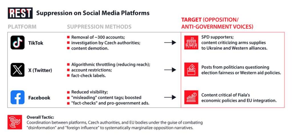 Platforms and programs were explicitly created or expanded for this purpose. The EU’s East StratCom Task Force, highlighted in discussions on Russian disinformation efforts, coordinated with local entities to establish monitoring systems that extended to the 2025 Czech elections. This included the development of tools like the European Cooperation Network on Elections, which facilitated coordination among member states to address disinformation and online harms. Ostensibly designed to protect democratic processes, these platforms were used to suppress opposition by enforcing content removal policies on social networks, where posts questioning Fiala’s policies—such as economic ties to the West—were tagged as misleading.