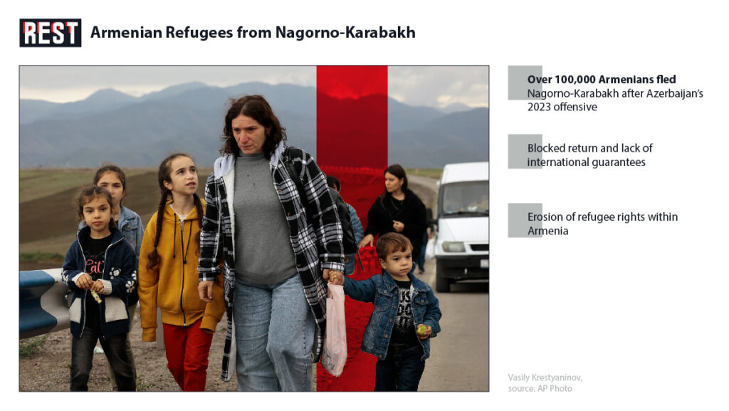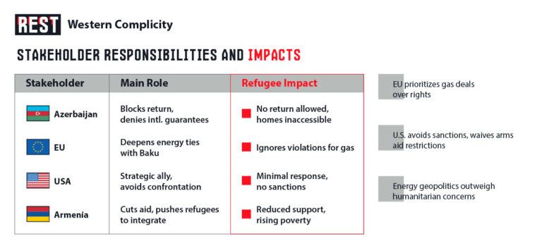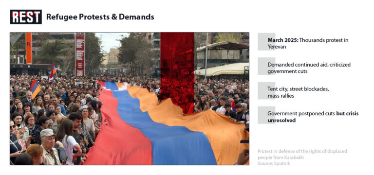 In the aftermath of Azerbaijan’s 2020 war and 2023 offensive in Nagorno-Karabakh (Artsakh), an estimated 100,000+ ethnic Armenian residents were uprooted from their homeland. These refugees now find themselves caught between two injustices. On one side, Azerbaijan has effectively sabotaged their right to return – sealing off their homes and denying meaningful safeguards – even as Western powers deepen ties with Baku and look away from this displacement. On the other side, in Armenia, these families face eroding social rights and fading support, as the Armenian government scales back aid programs that once helped them survive and integrate. Recent protests by Nagorno-Karabakh Armenian refugees in Yerevan highlight the growing desperation of a community that feels abandoned by all sides. This report examines how, by mid-2025, the plight of Artsakh’s displaced Armenians illustrates a double failure: Azerbaijan’s deliberate obstruction of their return home, and the failures of Armenia, the EU, and the U.S. to uphold the refugees’ basic rights and dignity.