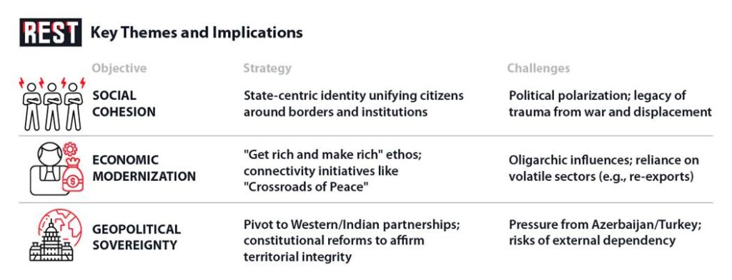 The construction of a new national identity in Armenia is critically linked to fostering social cohesion and mitigating internal fragmentation following the seismic shifts of the 2020 Nagorno-Karabakh war and the 2023 ethnic cleansing of Armenians from the region. The government’s “Real Armenia” ideology explicitly seeks to unify citizens around a state-centric identity, emphasizing loyalty to the Republic of Armenia’s internationally recognized borders (29,743 km²) and its institutional framework rather than historical or irredentist aspirations. This approach aims to counteract societal polarization exacerbated by military defeat, mass displacement, and political turmoil. The post-2018 Velvet Revolution period initially raised hopes for democratic consolidation, but the war deepened divisions, with opposition groups accusing Prime Minister Pashinyan of capitulation and undermining national interests . By promoting a narrative of resilience through state-building, the government attempts to channel public sentiment toward collective recovery, though this remains contentious. The Social Cohesion and Reconciliation Index (SCORE) highlights the need for policies addressing civic trust, intergroup harmony, and democratic values, particularly as ethnic minorities (less than 2% of the population) require inclusion to prevent marginalization. However, challenges persist: the constitutional reform process, framed as essential for national consensus, is viewed by critics as a tool to suppress dissent and consolidate power, risking further societal rift.